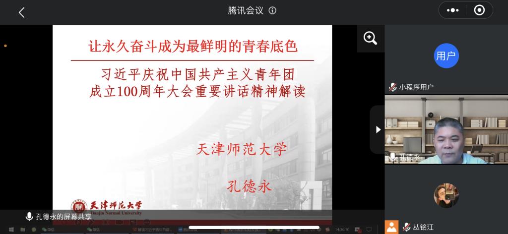 5月25日下午,“习近平总书记在庆祝中国共产主义青年团成立100周年大会上的讲话”会议精神解读专题讲座在枣庄学院市中校区召开,讲座由天津师范大学孔德永教授主讲,WilliamHill官网团总支书记、部分班级团支部书记、团干部、学生会干部及学生代表通过线上会议形式参会。