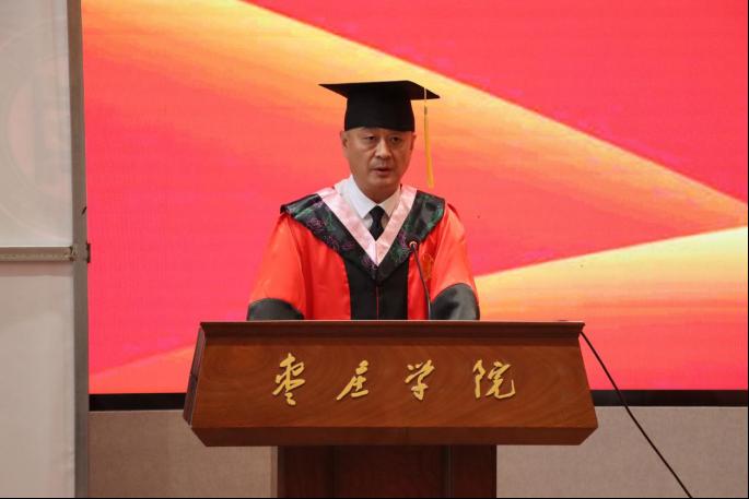 刘振宇在讲话中对毕业生同学在校期间取得的成绩及新冠疫情期间的表现表示肯定,对同学们为学校高质量发展做出的努力表示感谢。毕业之际,他对即将走出枣院的学子们提出了三点希望:一是希望同学们心怀国之大者,志存高远,不负青春。用内心感应时代脉搏,把对祖国血浓于水、与人民同呼吸共命运的情感贯穿学业全过程、融汇在事业追求中,争做堪当民族复兴重任的时代新人。二是希望同学们心系民之要者,担当有为,奋斗不止。希望同学们勇于做难事,勤于做实事,用实实在在的行动、一点一滴的积累去实现梦想,在属于自己的长征路上收获踏实丰盈的人生。三是希望同学们心存己之念者,固守本真,坚持学习。希望同学们始终坚守本真,不断弘扬枣院人团结友爱、自立自强、敢于争先、锲而不舍的优秀品质。保持良好的学习习惯,保持旺盛的求知欲,坚持向书本学习,向社会学习。
