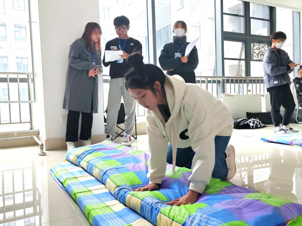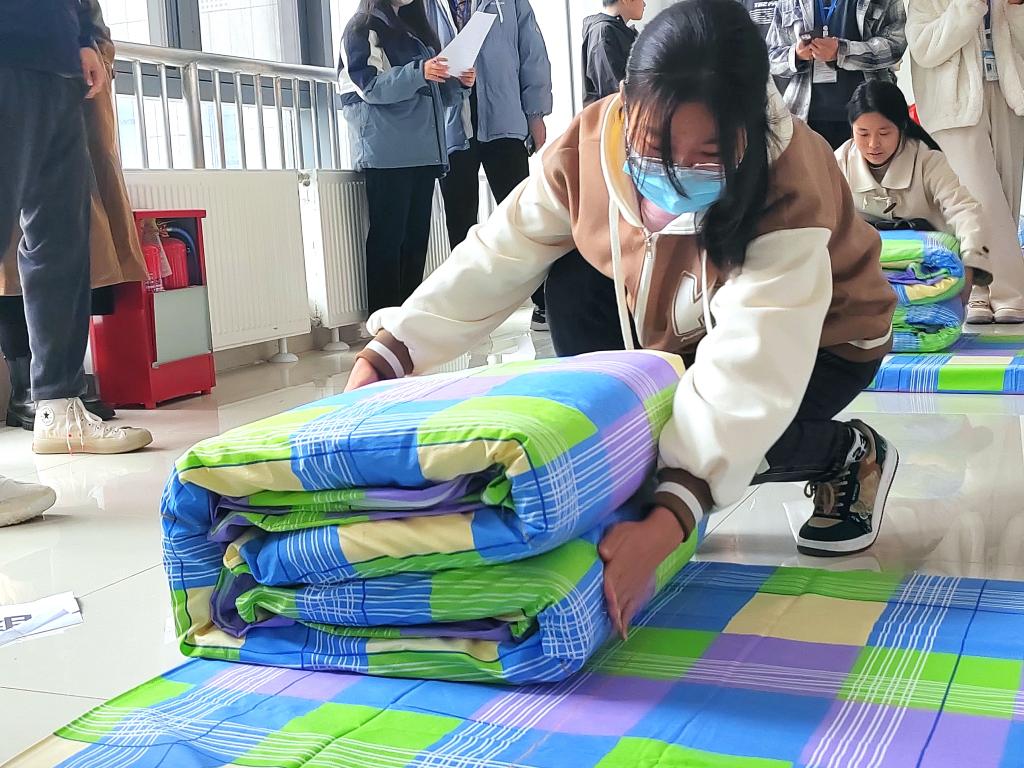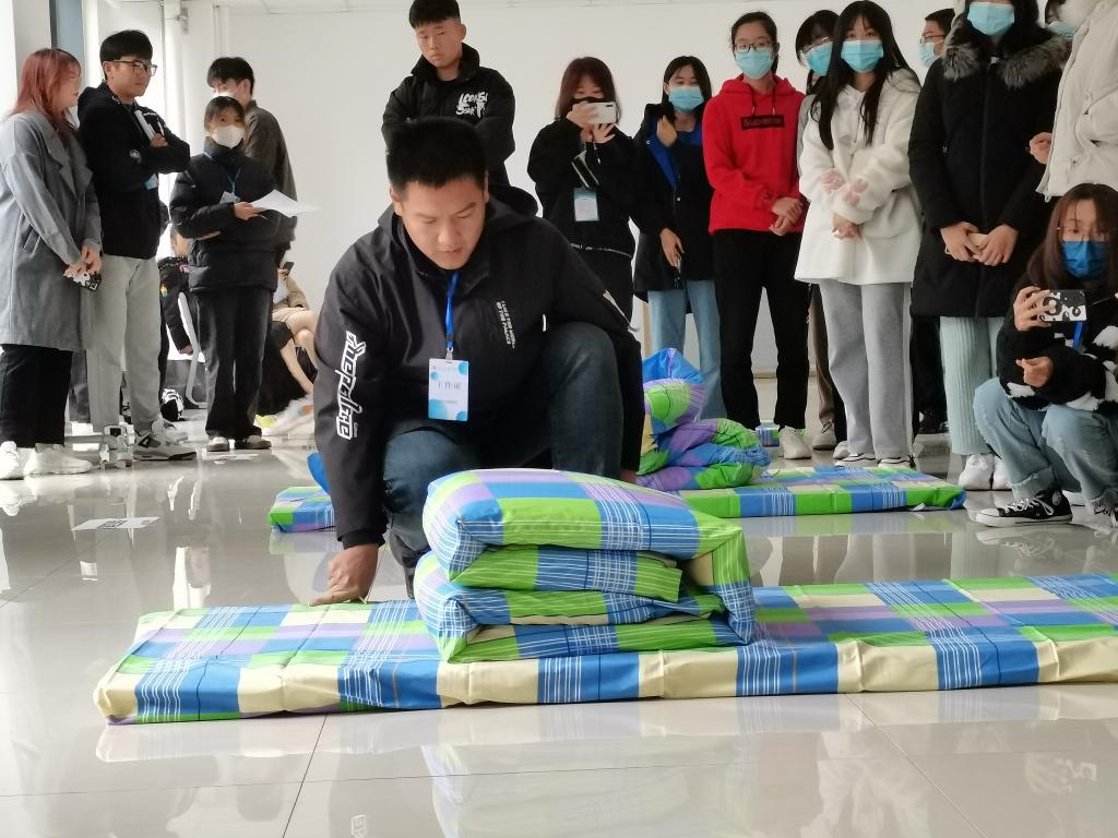 比赛倒计时开始,参赛选手们要在三分钟之内叠整并摆放好被子。同学们迅速铺平被子进行折叠,不断地压实被子,最后修整棱角,让被子呈“豆腐块”状,比赛紧张而有序的进行着。最终,角逐出一等奖三名,二等奖六名,三等奖九名。