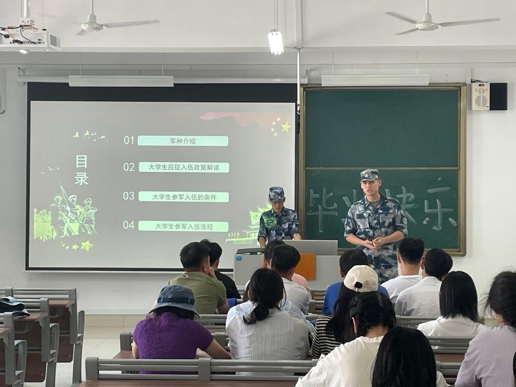 本次宣传活动加强了同学们对部队军事、科技素质建设的认识,强化同学们服兵役的责任感和参军保卫祖国的意识,激发了学生的参军报国热情,在全班学生中营造了参军光荣的浓厚氛围。