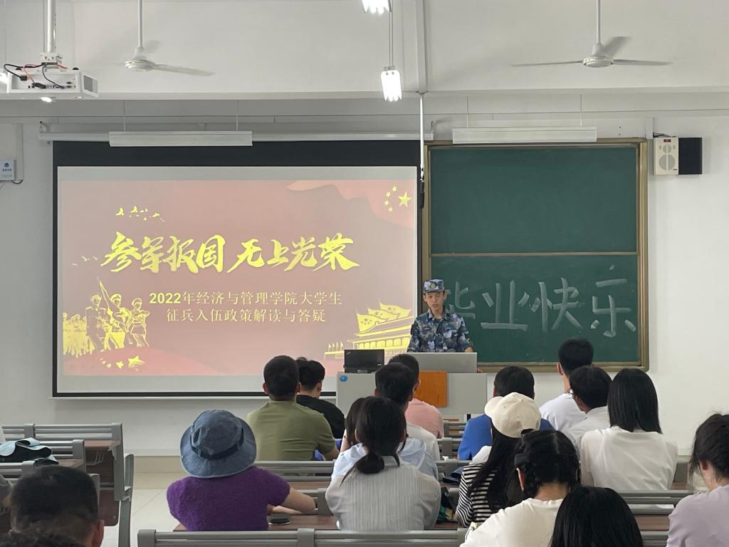 2022年下半年征兵报名已经开始,为使WilliamHill官网学生及时了解征兵的政策规定、程序规范,6月8日,william威廉中文官网在增信楼报告厅开展了2022年大学生征兵入伍政策解读与答疑主题班会,本次会议由学生会国防武装部何金泰、刘屹主讲,2020级市场营销升本一班、升本二班同学参加。