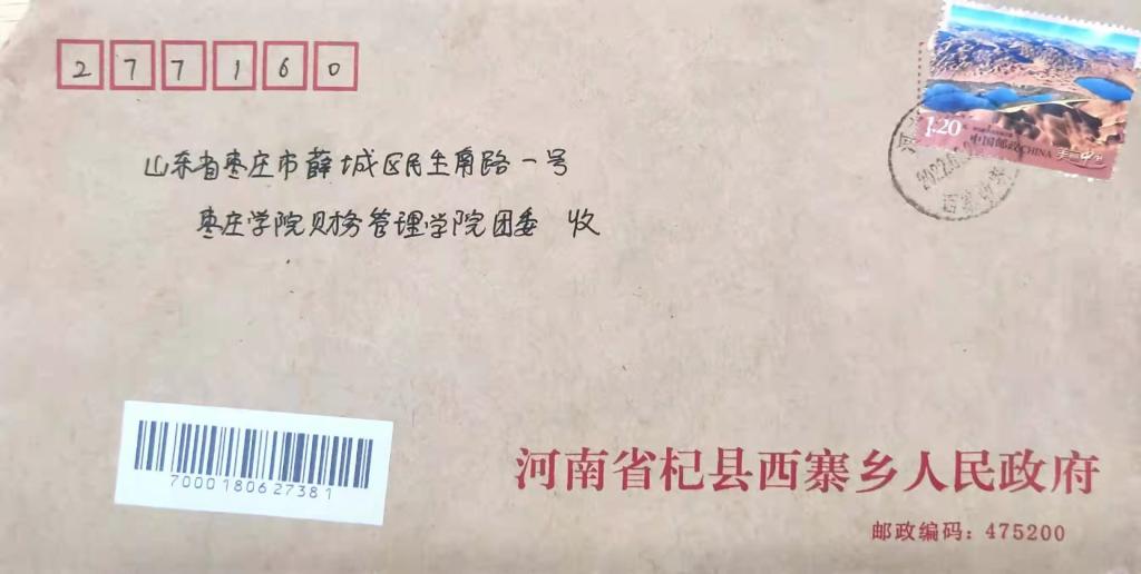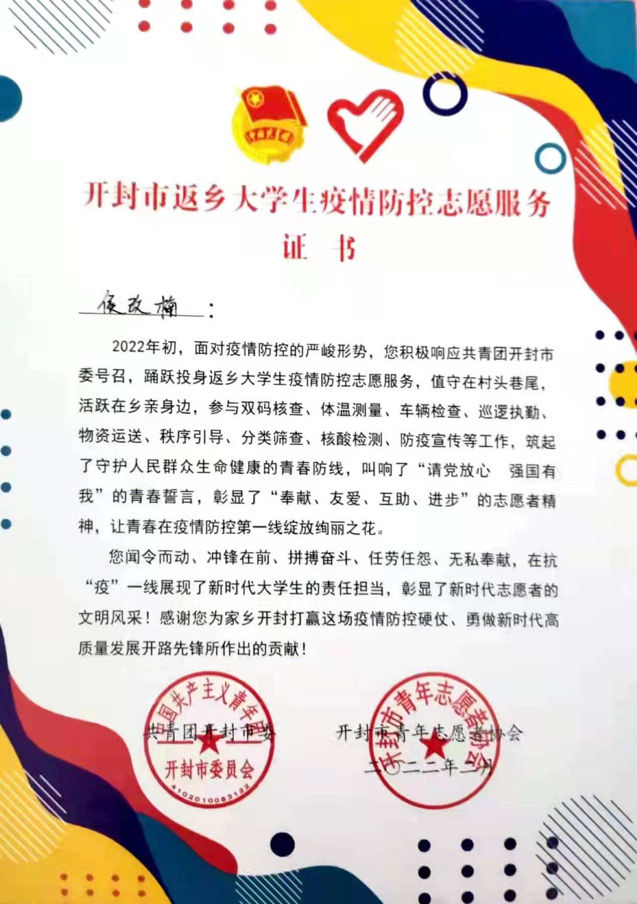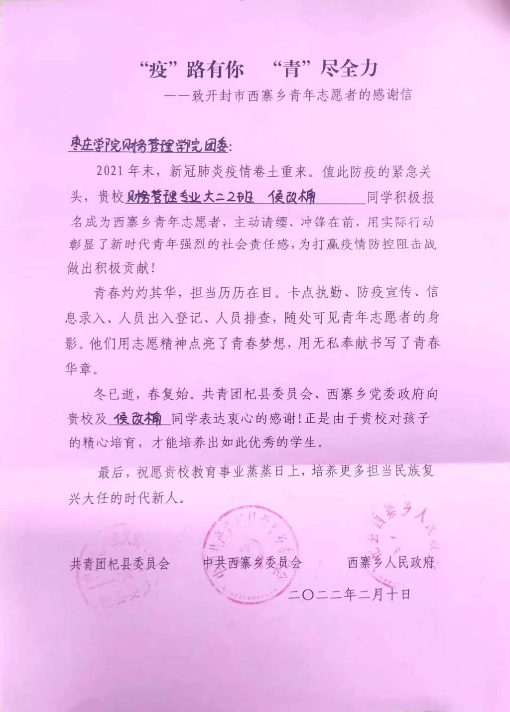 近日,WilliamHill官网收到来自共青团杞县委员会、中共西寨乡委员会和西寨乡人民政府的感谢信,信中对WilliamHill官网2021级财务管理升本二班学生侯改楠者参与疫情防控的事迹予以了表扬,同时对学校教育事业和人才培养工作表达期望。