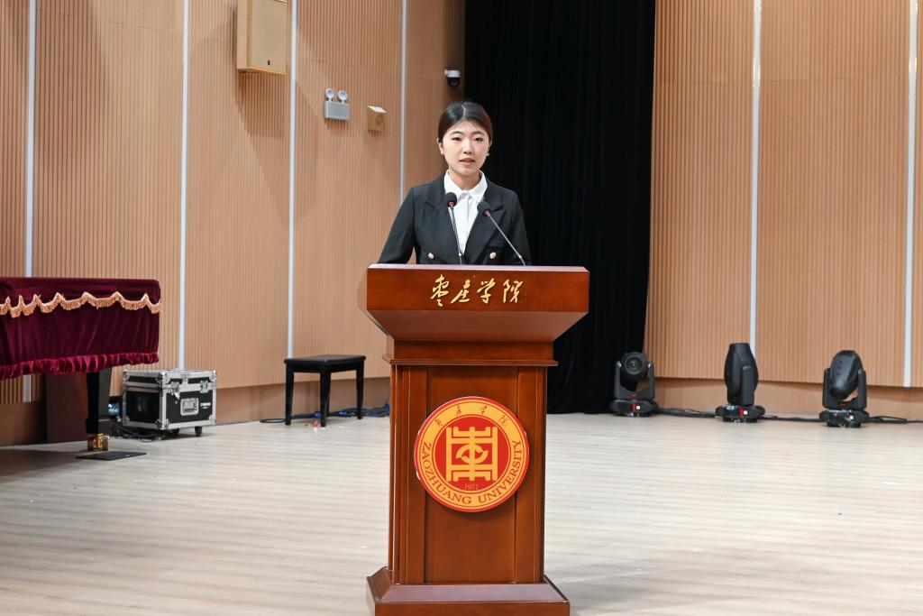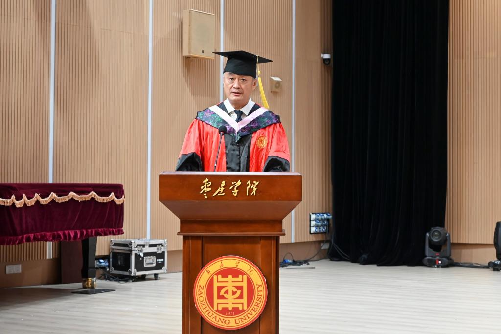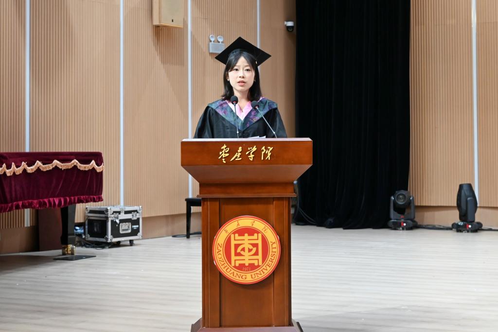 毕业生代表王慧玲回顾了在枣庄学院的四年求学路,表达了对母校、对老师最衷心的感谢,表示将继续追求人生理想,勇担时代重任。