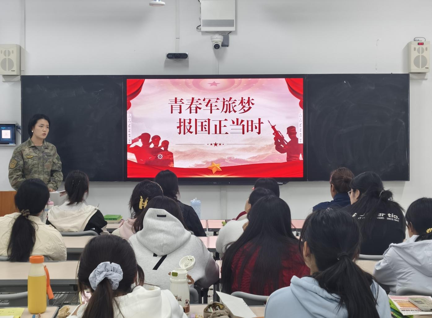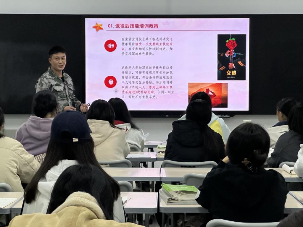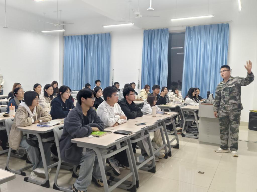 在宣讲过程中,退伍大学生们结合《中华人民共和国兵役法》和最新征兵政策,从报名条件、流程安排、优待政策、发展路径四个维度进行系统讲解。针对经管学子关注的“入伍与学业平衡”“经济待遇保障”“考研升学优惠”等问题,通过数据对比和案例分析,详细阐释了大学生入伍的专项政策,帮助25级新生建立对军旅生涯的科学认知。同时,退伍大学生们结合自身军旅经历,分享了他们在部队的训练生活、成长蜕变与收获感悟,生动讲述了军营生活的独特魅力,朴实而真挚的分享引发了现场学子的强烈共鸣。