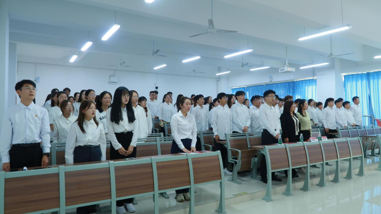 伴随着庄严的国歌和团歌,入团仪式缓缓拉开帷幕。活动伊始,张璇宣读新发展团员名单,团员代表任斯羽介绍团章和团徽并为新发展团员佩戴团徽。随后,团员代表王铭坤带领新发展团员宣誓,要遵守团的章程、服从团的纪律,担起青年责任,不负韶华。稍后,团员代表田长丰和新发展团员代表殷鸿宇分别进行发言,号召大家要积极履行团员义务,不负时光,不负期望。仪式最后,张璇表示,新团员要树立崇高的理想,发挥各自特长,为共青团的发展贡献自己的力量。