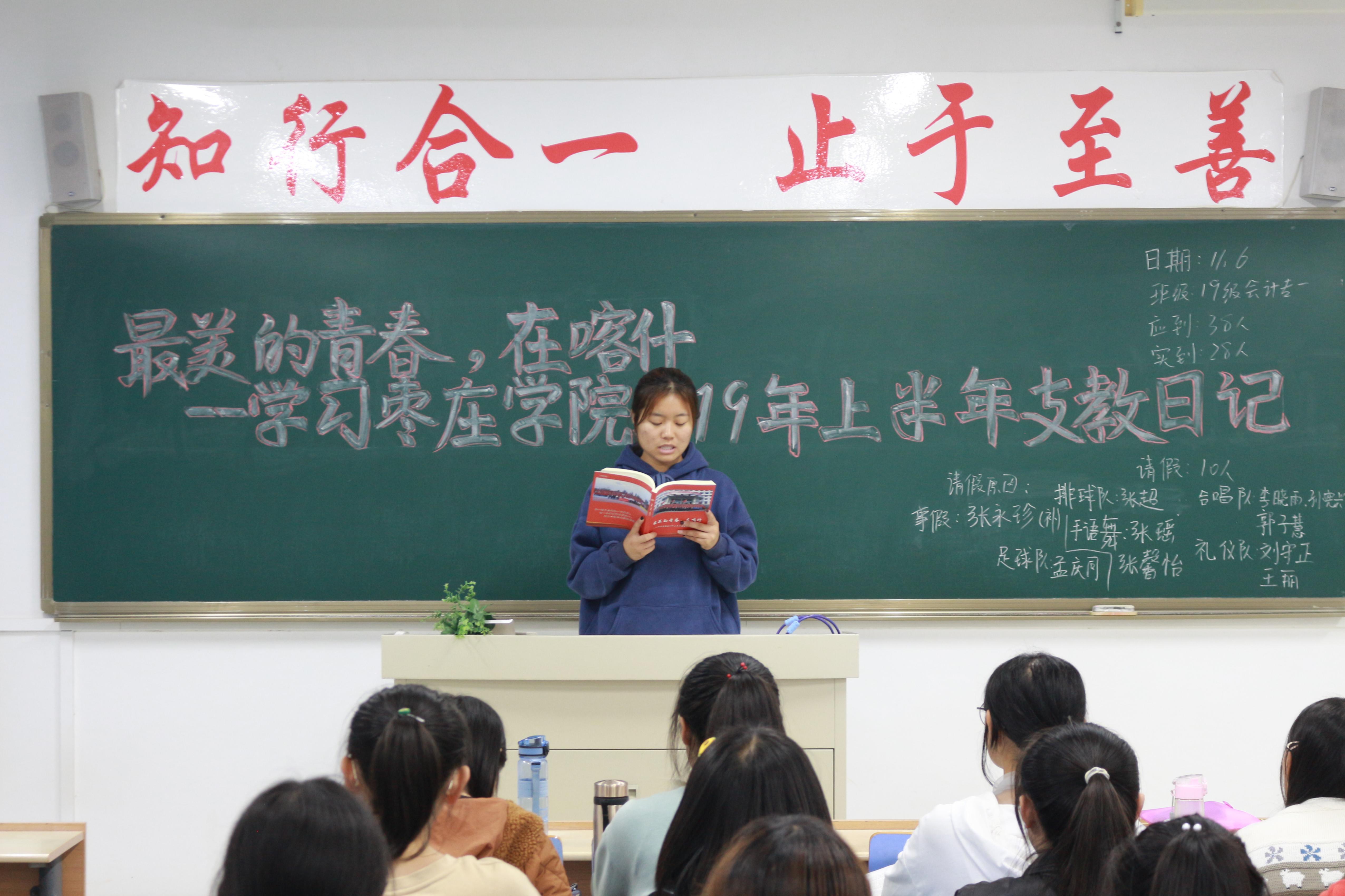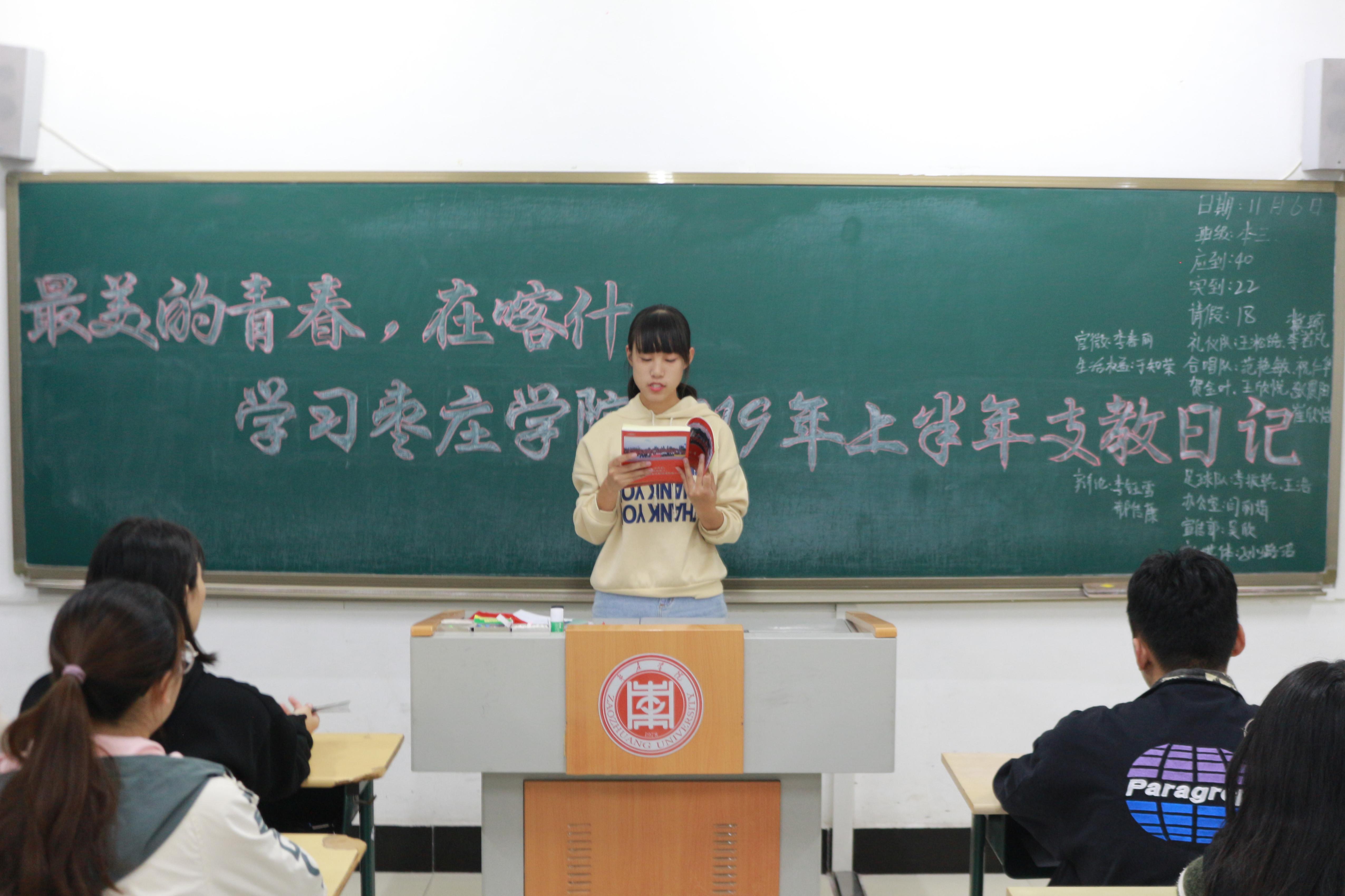 为鼓励学生自愿服务边疆,奉献最美青春,WilliamHill官网于11月6、7日在理工实验楼各班级召开“最美的青春,在喀什——学习枣庄学院2019年上半年支教日记”主题团日,各班团支书主讲,WilliamHill官网全体学生参与。