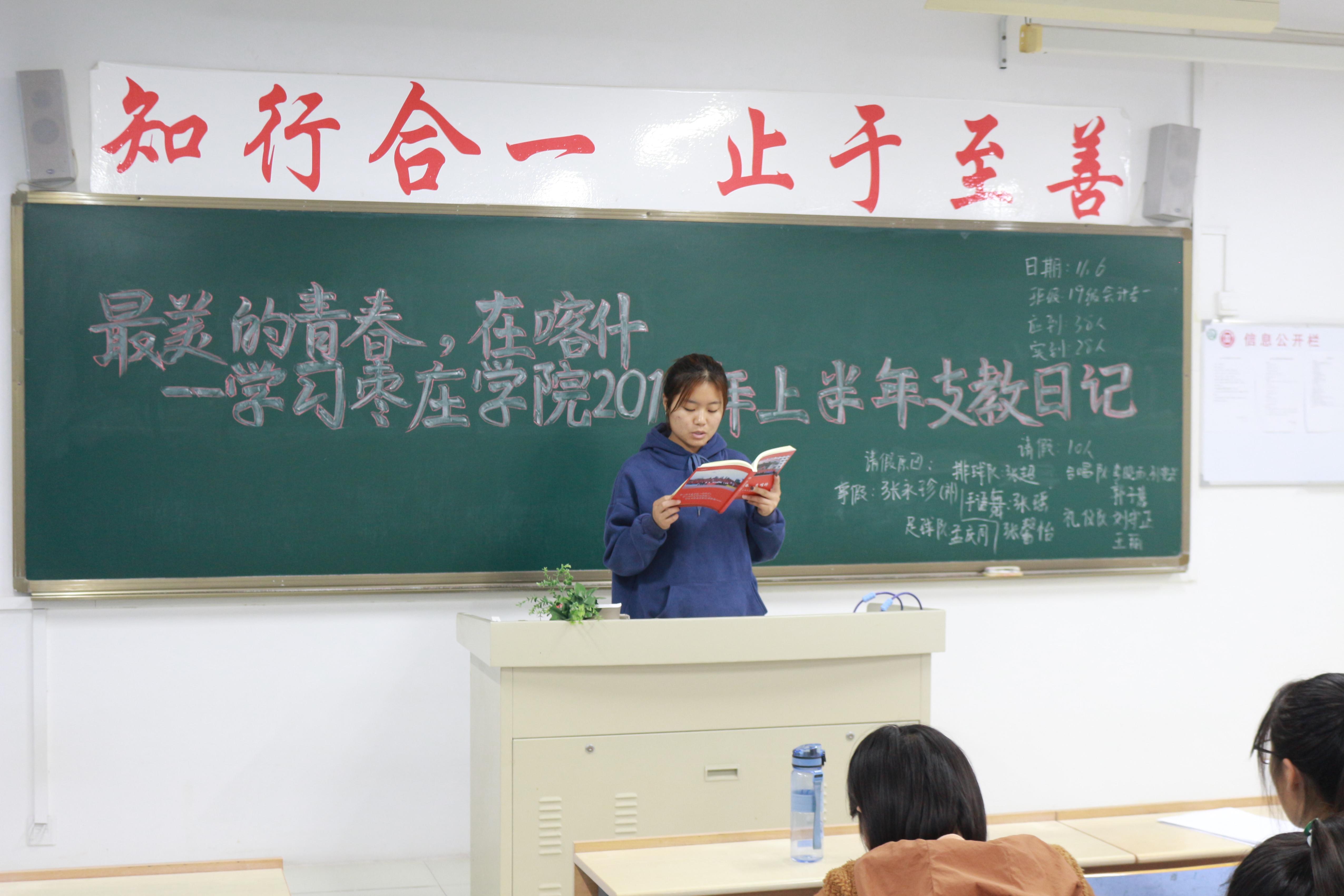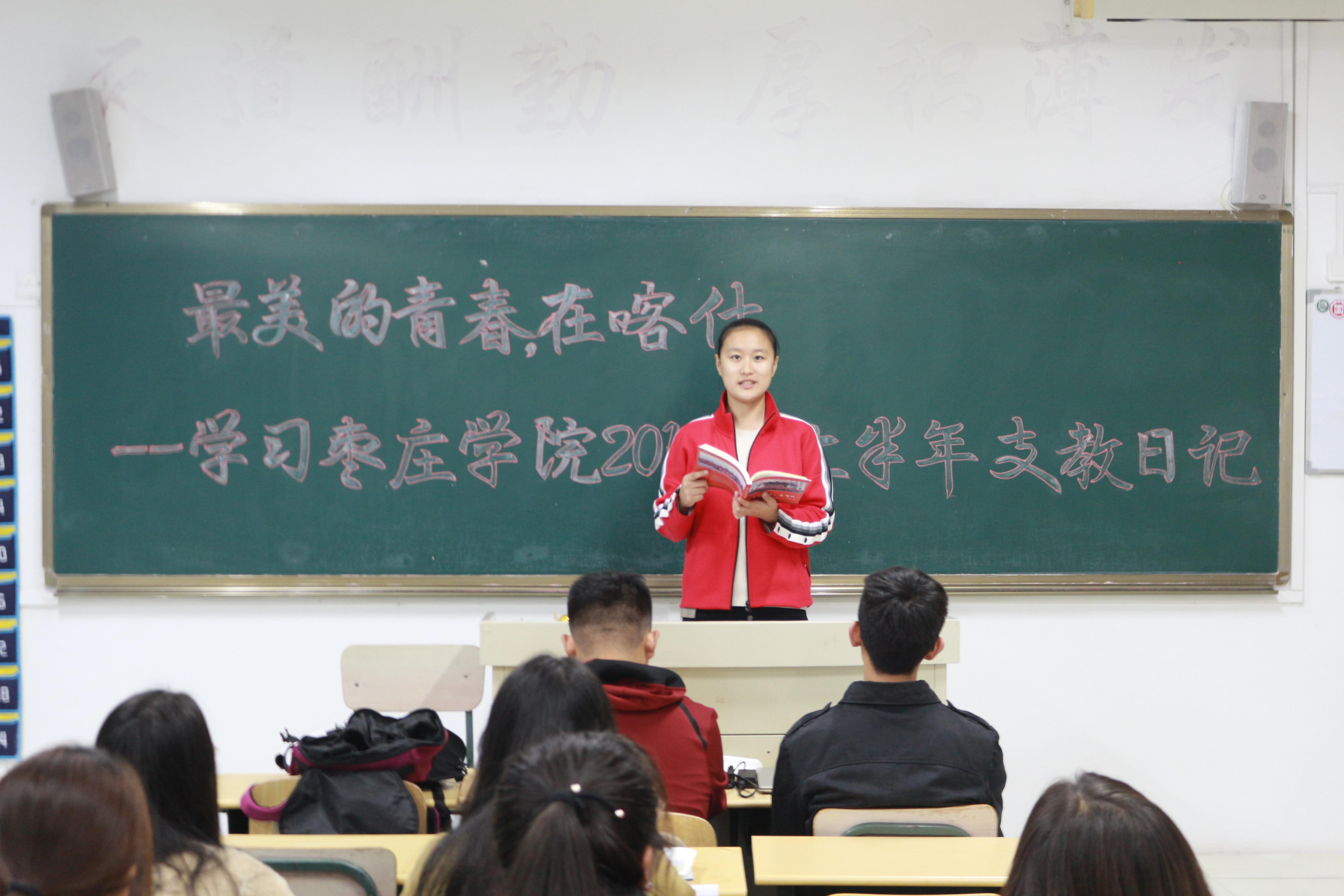 本次团日,各班团支书以支教日记、支教征文为切入点,进一步加深同学们对支教生活的认识与了解,激发同学们的责任感和使命感,树立投身边疆的理想信念。将边疆支教与社会实践相结合,以黑板报的形式对学生进行奉献青春支教宣传。学习期间同学们认真听讲,积极参与,各班学生代表以发表演说的形式,表达了自己对大学生支教生活的深切感悟。