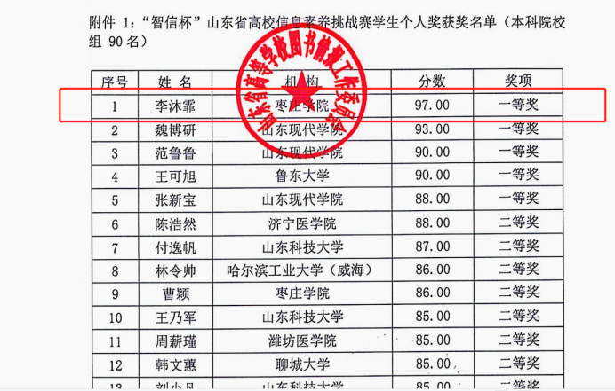 WilliamHill官网21经济统计学本科1班李沐霏在第二届“智信杯”山东省高校信息素养挑战赛中荣获学生个人奖一等奖,并为山东省本科院校组第一名。